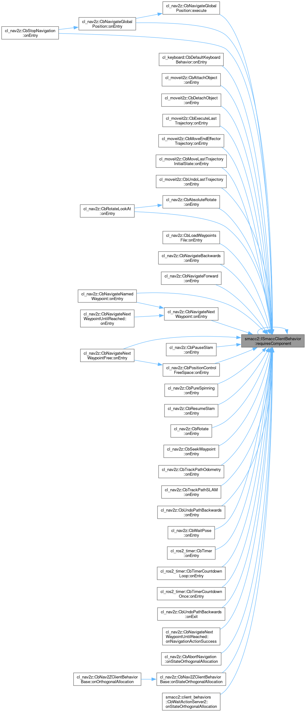 Referenced by cl_nav2z::CbNavigateGlobalPosition::execute(), cl_keyboard::CbDefaultKeyboardBehavior::onEntry(), cl_moveit2z::CbAttachObject::onEntry(), cl_moveit2z::CbDetachObject::onEntry(), cl_moveit2z::CbExecuteLastTrajectory::onEntry(), cl_moveit2z::CbMoveEndEffectorTrajectory::onEntry(), cl_moveit2z::CbMoveLastTrajectoryInitialState::onEntry(), cl_moveit2z::CbUndoLastTrajectory::onEntry(), cl_nav2z::CbAbsoluteRotate::onEntry(), cl_nav2z::CbLoadWaypointsFile::onEntry(), cl_nav2z::CbNavigateBackwards::onEntry(), cl_nav2z::CbNavigateForward::onEntry(), cl_nav2z::CbNavigateGlobalPosition::onEntry(), cl_nav2z::CbNavigateNamedWaypoint::onEntry(), cl_nav2z::CbNavigateNextWaypoint::onEntry(), cl_nav2z::CbNavigateNextWaypointFree::onEntry(), cl_nav2z::CbPauseSlam::onEntry(), cl_nav2z::CbPositionControlFreeSpace::onEntry(), cl_nav2z::CbPureSpinning::onEntry(), cl_nav2z::CbResumeSlam::onEntry(), cl_nav2z::CbRotate::onEntry(), cl_nav2z::CbRotateLookAt::onEntry(), cl_nav2z::CbSeekWaypoint::onEntry(), cl_nav2z::CbStopNavigation::onEntry(), cl_nav2z::CbTrackPathOdometry::onEntry(), cl_nav2z::CbTrackPathSLAM::onEntry(), cl_nav2z::CbUndoPathBackwards::onEntry(), cl_nav2z::CbWaitPose::onEntry(), cl_ros2_timer::CbTimer::onEntry(), cl_ros2_timer::CbTimerCountdownLoop::onEntry(), cl_ros2_timer::CbTimerCountdownOnce::onEntry(), cl_nav2z::CbUndoPathBackwards::onExit(), cl_nav2z::CbNavigateNextWaypointUntilReached::onNavigationActionSuccess(), cl_nav2z::CbAbortNavigation::onStateOrthogonalAllocation(), cl_nav2z::CbNav2ZClientBehaviorBase::onStateOrthogonalAllocation(), smacc2::client_behaviors::CbWaitActionServer2< ActionT >::onStateOrthogonalAllocation(), and requiresComponent().
