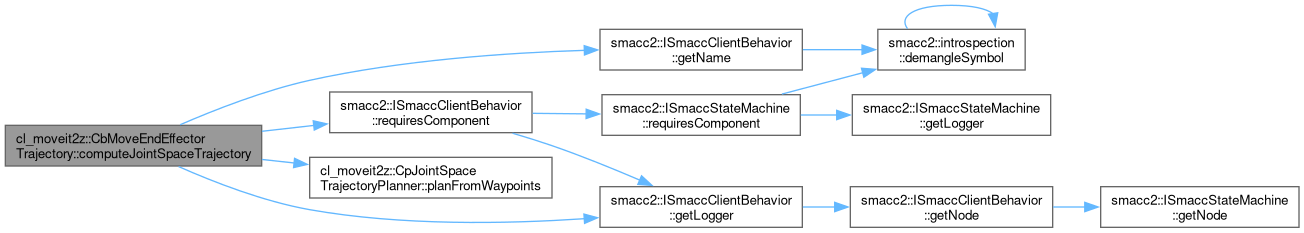 References computeJointSpaceTrajectory(), createMarkers(), smacc2::introspection::demangleSymbol(), endEffectorTrajectory_, executeJointSpaceTrajectory(), generateTrajectory(), smacc2::ISmaccClientBehavior::getLogger(), smacc2::ISmaccClientBehavior::getName(), cl_moveit2z::INCORRECT_INITIAL_STATE, cl_moveit2z::JOINT_TRAJECTORY_DISCONTINUITY, movegroupClient_, cl_moveit2z::ClMoveit2z::postEventMotionExecutionFailed(), smacc2::SmaccAsyncClientBehavior::postFailureEvent(), postIncorrectInitialStateEvent, postJointDiscontinuityEvent, cl_moveit2z::CpTrajectoryHistory::pushTrajectory(), smacc2::ISmaccClientBehavior::requiresClient(), smacc2::ISmaccClientBehavior::requiresComponent(), cl_moveit2z::CpTrajectoryVisualizer::setTrajectory(), smacc2::SOFT, and cl_moveit2z::SUCCESS.