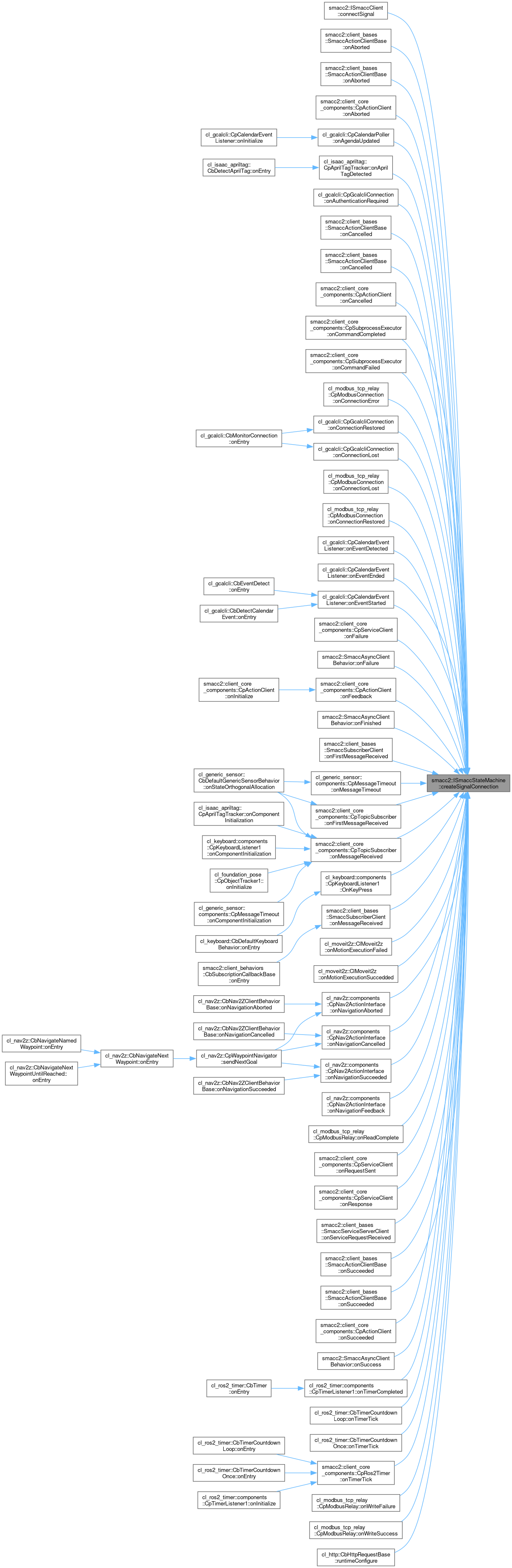 | smacc2::SmaccSignalConnection | createSignalConnection (TSmaccSignal &signal, TMemberFunctionPrototype callback, TSmaccObjectType *object) |