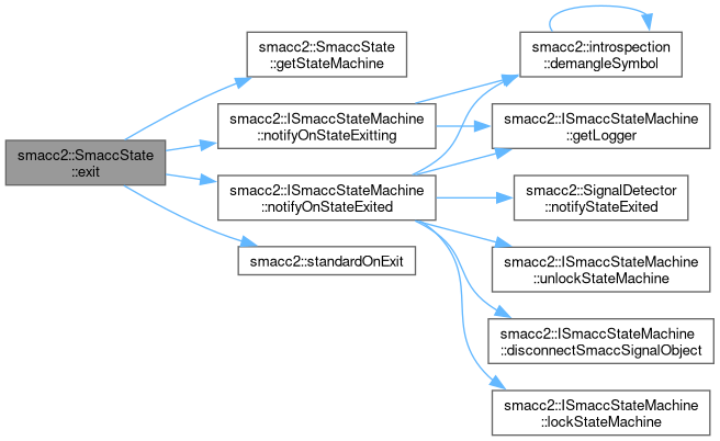References smacc2::SmaccState< MostDerived, Context, InnerInitial, historyMode >::getStateMachine(), smacc2::ISmaccStateMachine::notifyOnStateExited(), smacc2::ISmaccStateMachine::notifyOnStateExitting(), smacc2_state_onExit_end, smacc2_state_onExit_start, smacc2::standardOnExit(), and STATE_NAME.